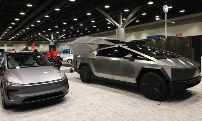 Xe điện Model Y và bán tải Cybertruck của Tesla đã được bố trí tại khu vực của hãng Mỹ tại Vancouver Auto Show nhưng đã được đưa đi trước khi sự kiện bắt đầu. Ảnh: Vancouver Sun