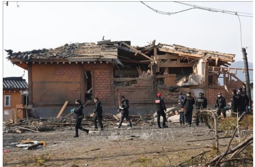 Điều tra viên tại hiện trường vụ máy bay chiến đấu ném bom nhầm trong cuộc tập trận bắn đạn thật ở Pocheon, Hàn Quốc ngày 7/3/2025.