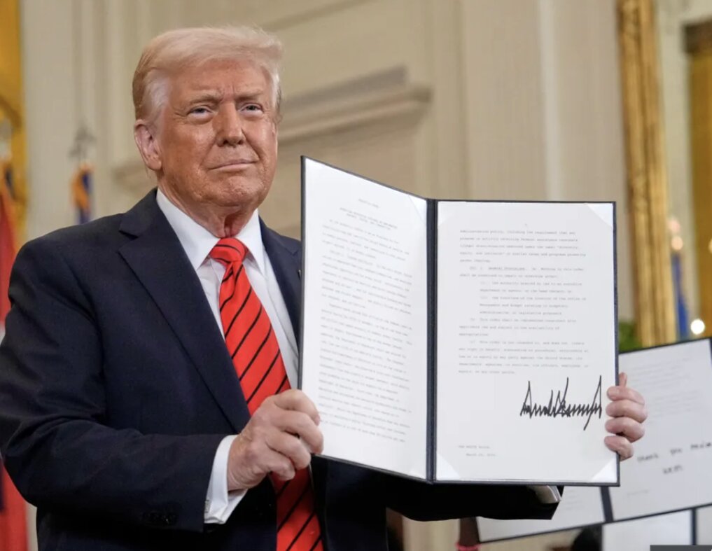 Tổng thống Donald Trump giơ một sắc lệnh hành pháp đă kư tại Nhà Trắng, ngày 20/3 (Ảnh: AP)