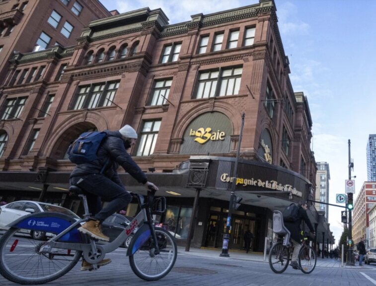 Người đi xe đạp ngang trung tâm thương mại của Hudson’s Bay tại Montreal ngày 17/3. Ảnh: AP