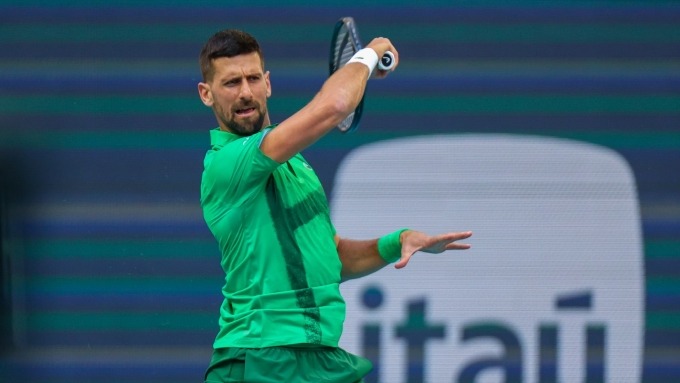 Djokovic đánh thuận tay trong trận gặp Musetti, ở vòng bốn Miami Mở rộng hôm 26/3, trên sân Hard Rock, Mỹ. Ảnh: Reuters