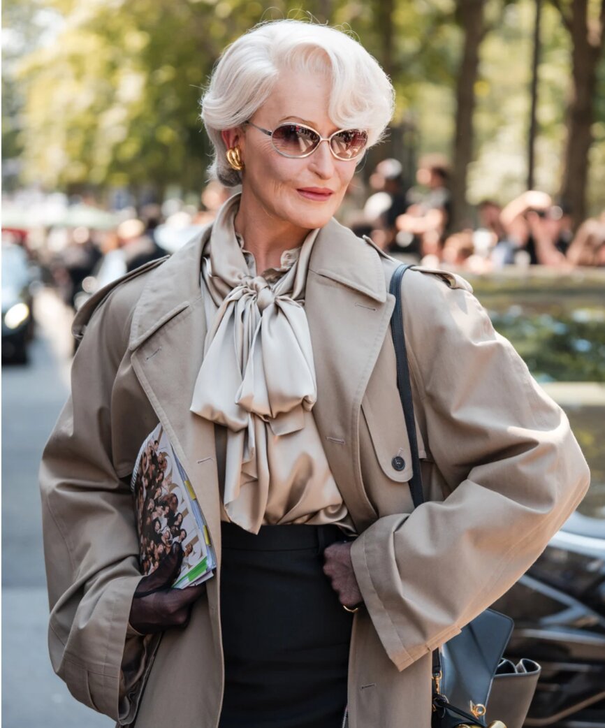 Alexis Stone tham dự buổi trình diễn Haute Couture năm 2024 của Balenciaga tại Paris trong trang phục của Miranda Priestly, nhân vật hư cấu trong "The Devil Wears Prada". Ảnh: Getty Images