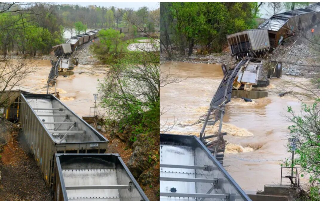 Tại Mammoth Spring, bang Arkansas, một đoàn tàu đã buộc phải dừng lại trên cầu vào sáng 5/4. Mưa lũ dữ dội đã cuốn trôi một phần cây cầu, khiến nhiều toa tàu bị trật bánh, theo thông tin từ hãng đường sắt BNSF.