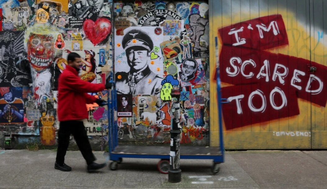 Một công nhân đi ngang qua bức tranh graffiti ở Đông London mô tả ông Musk mặc quân phục Đức Quốc xã thời Thế chiến II. Ảnh: Reuters.