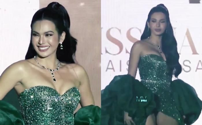 Tuy nhiên, "con cưng" của ông Nawat lại vô tình hớ hênh, lộ nội y khi sải bước xuống bậc thang. Nguyên nhân bắt nguồn từ chi tiết xẻ tà cao vút khiến Christine Juliane Opiaza khó lòng kiểm soát những tình huống bất ngờ. Mặt khác, phần nội y và trang phục của Á hậu 1 Hoa hậu Hòa bình Quốc tế 2024 mang sự đồng điệu về màu sắc, nên phần nào giảm thiểu đi cảm giác phản cảm và khó chịu.