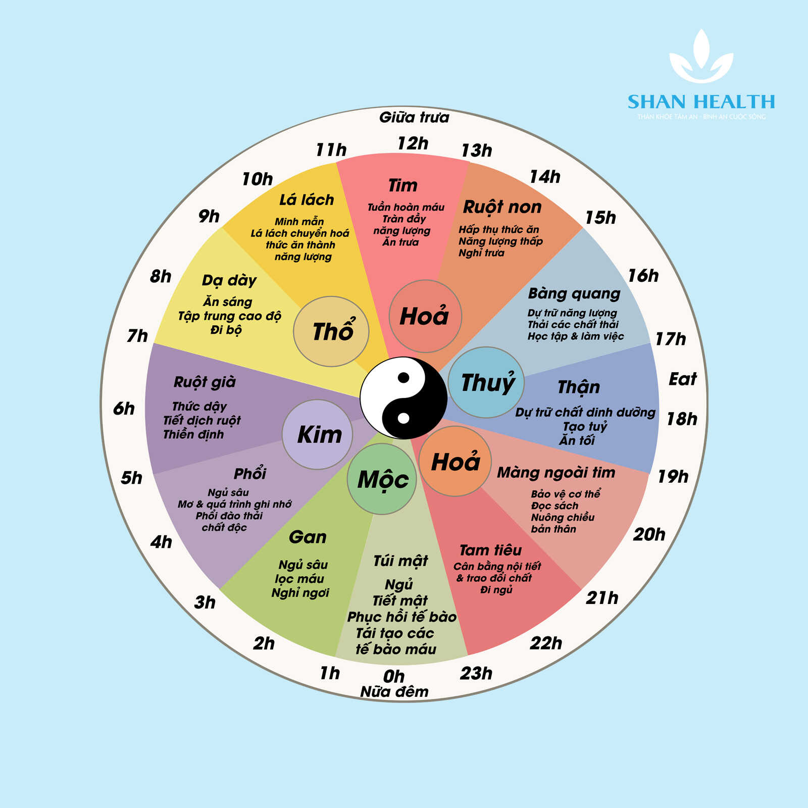 * Từ 11 giờ sáng-1 giờ chiều (giờ Ngọ): Khoảng thời gian này là lý tưởng để ăn trưa, việc ngủ trưa một giờ hoặc thưởng thức một tách trà cũng được khuyến cáo trong khoảng thời gian này.
