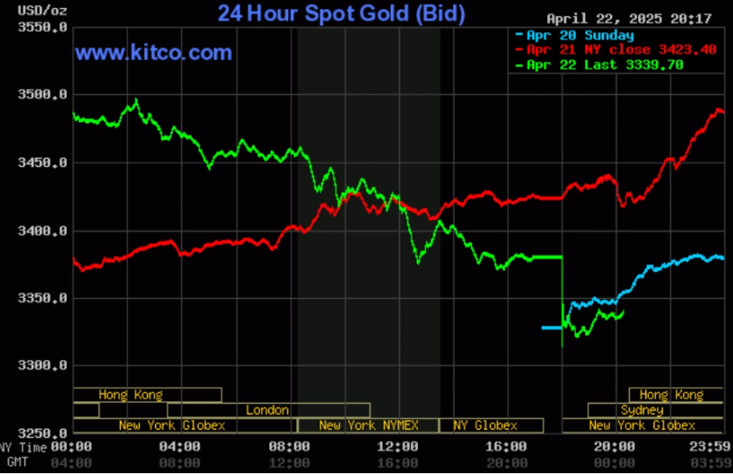Chốt phiên giao dịch 22/4, giá vàng thế giới giao ngay giảm 43 USD xuống 3.379 USD một ounce, sau khi có thời điểm chạm 3.500 USD. Sang phiên sáng nay, giá tiếp tục mất thêm hơn 40 USD, hiện về 3.339 USD.