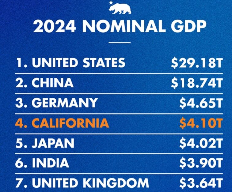 California tuyên bố trở thành nền kinh tế lớn thứ 4 thế giới, sau khi GDP danh nghĩa của bang này đạt 4.100 tỷ USD, vượt qua Nhật Bản ở mức 4.020 tỷ USD, chỉ xếp sau Mỹ, Trung Quốc và Đức.