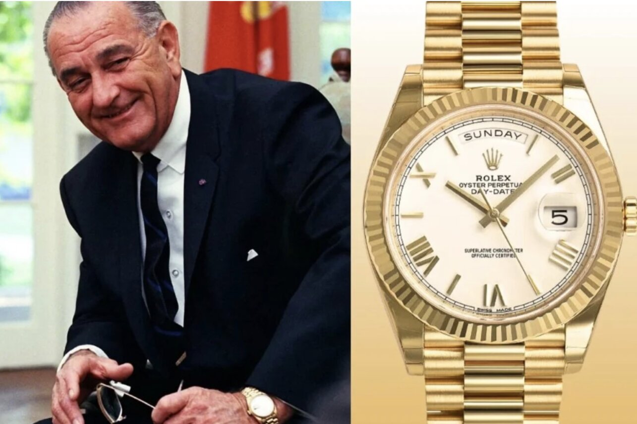Rolex Day-Date có biệt danh “President Watch” nhờ mối liên hệ với các Tổng thống Mỹ, bắt đầu với Tổng thống thứ 36 Lyndon B. Johnson (nhiệm kỳ 1963–1969). Ông Johnson thường xuyên đeo một mẫu Day-Date vàng nguyên khối, và thói quen tặng Rolex cho người quen của ông đã nâng cao uy tín của mẫu đồng hồ này. Theo chuyên trang về đồng hồ Hodinkee, Tổng thống Johnson từng tặng một chiếc Rolex vàng 18K cho bác sĩ tim mạch của mình, khắc dòng chữ “JWH / Love LBJ,” ngay trước khi qua đời vào năm 1973, thể hiện sự gắn bó cá nhân với thương hiệu. Rolex đã tận dụng mối liên hệ này, quảng cáo Day-Date là “Chiếc Đồng Hồ của Tổng Thống” vào năm 1966.
