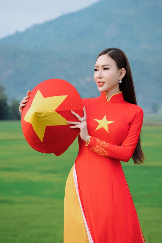 Khác với hình ảnh lộng lẫy bên đầm dạ hội, vương miện trong những bộ ảnh kỷ niệm đăng quang thường thấy, Hoa hậu Lương Thị Thùy Dung gây bất ngờ khi chọn áo dài sắc đỏ in ngôi sao vàng 5 cánh cho bộ ảnh đặc biệt này.