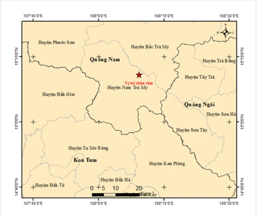 Tâm chấn trận động đất 3,8 độ tối nay ở khu vực huyện Nam Trà My, tỉnh Quảng Nam.