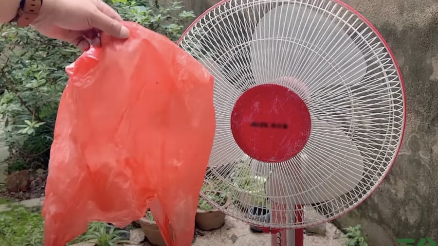 Lấy một chiếc túi nilon lớn phủ kín bên ngoài lồng quạt. Có thể buộc miệng túi để cố định cho túi không bị rơi ra ngoài khi quạt chạy. Cắm điện và bật quạt ở số lớn. Gió mạnh sẽ làm các chất bẩn bám trên bề mặt cánh quạt và lồng quạt văng ra ngoài. Cặn bẩn được thổi ra sẽ được túi nilon chặn lại. Bật quạt liên tục trong vòng 5 phút để các chất bẩn được đẩy hết ra ngoài.