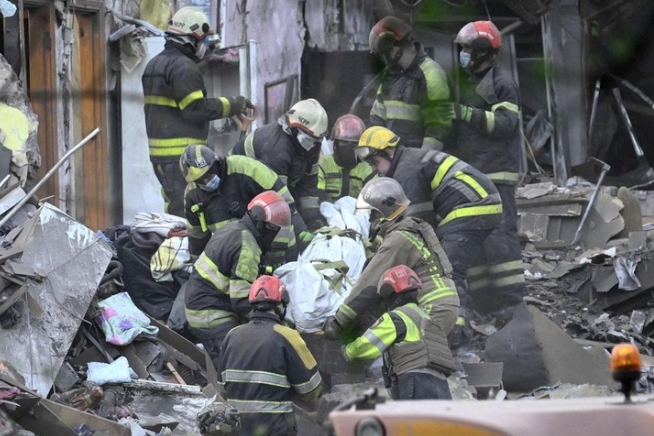 Lực lượng cứu hộ đang khiêng thi thể nạn nhân tại hiện trường vụ tấn công bằng tên lửa ở Kiev ngày 24/4 khiến 12 người thiệt mạng.