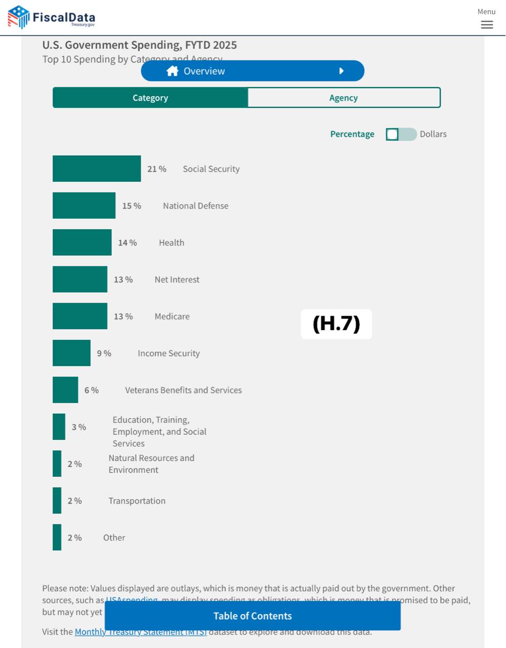 b. Vay nợ nhiều làm tăng chi do trả lăi, tăng thâm hụt ngân sách… càng phải tăng vay nợ. Lượng thành chất và trở thành vấn đề thực sự khi mục chi trả lăi chiếm tỷ trọng quá lớn trong tổng chi chính phủ sẽ ảnh hưởng trực tiếp tới các chương tŕnh quốc gia, đầu tư và an sinh xă hội (H.2). Elon Musk kêu như (H.1) là có lư của nó. Ví dụ năm 2023 chi trả lăi chiếm 13% trong khi chi quốc pḥng chỉ 15% tổng chi (H.7), năm 2024 là 12% và 17% (H. 8): tương đương nhau rồi.