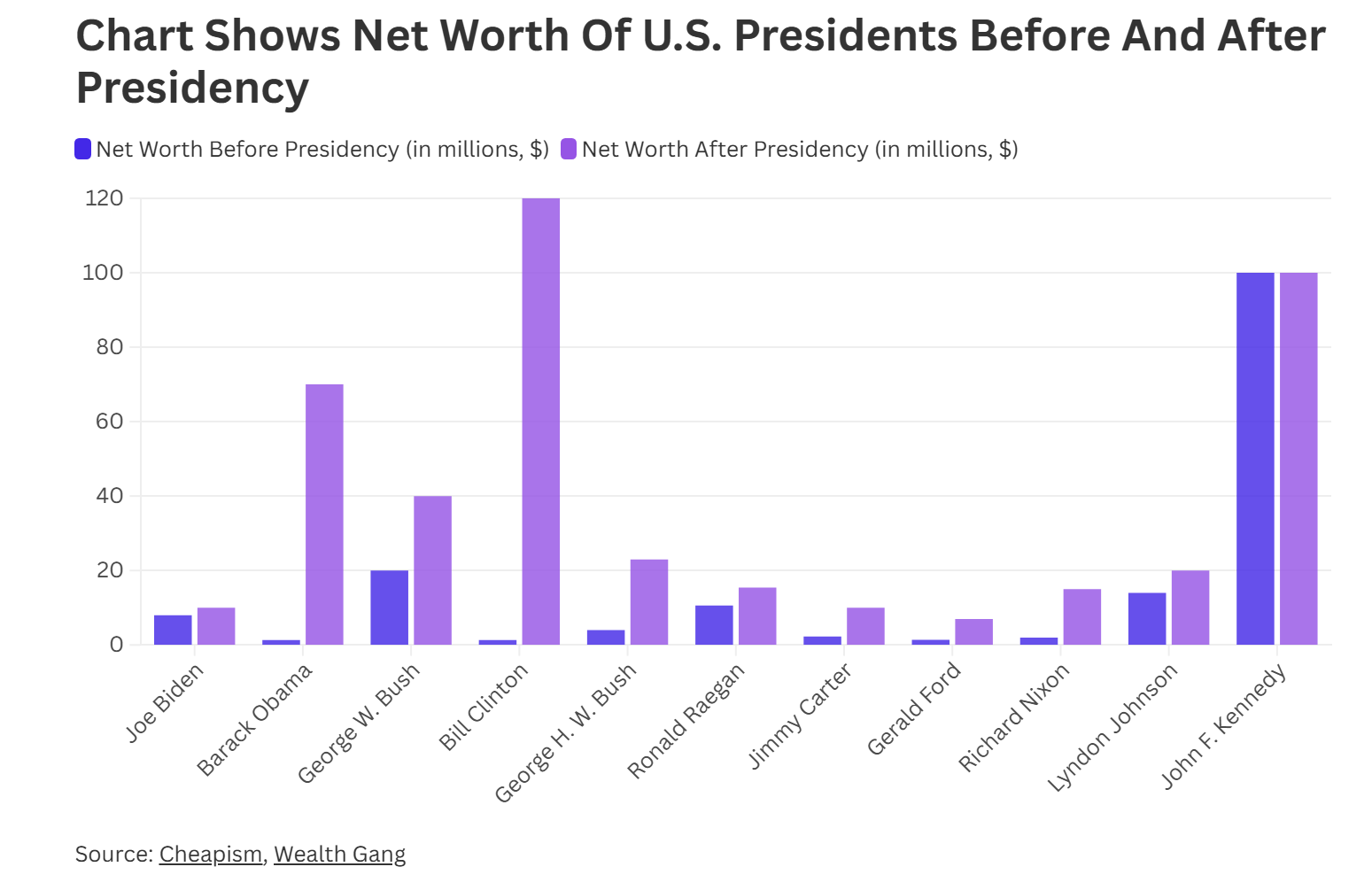 Mặc dù vậy, vị tổng thống có giá trị tài sản ròng cao thứ hai sau khi rời nhiệm sở là John F. Kennedy, một đảng viên Dân chủ tại nhiệm từ năm 1961 đến năm 1963.