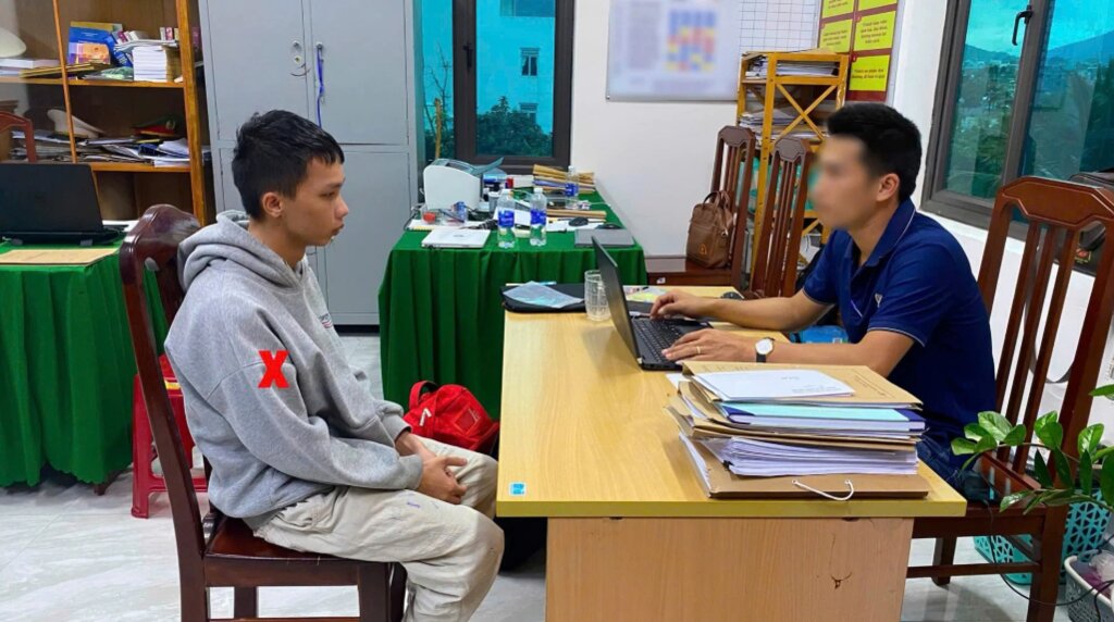 Lực lượng công an làm việc với Nguyễn Duy Quang - đối tượng dùng tài khoản ảo ép học sinh dưới 16 tuổi vào mục đích khiêu dâm.
