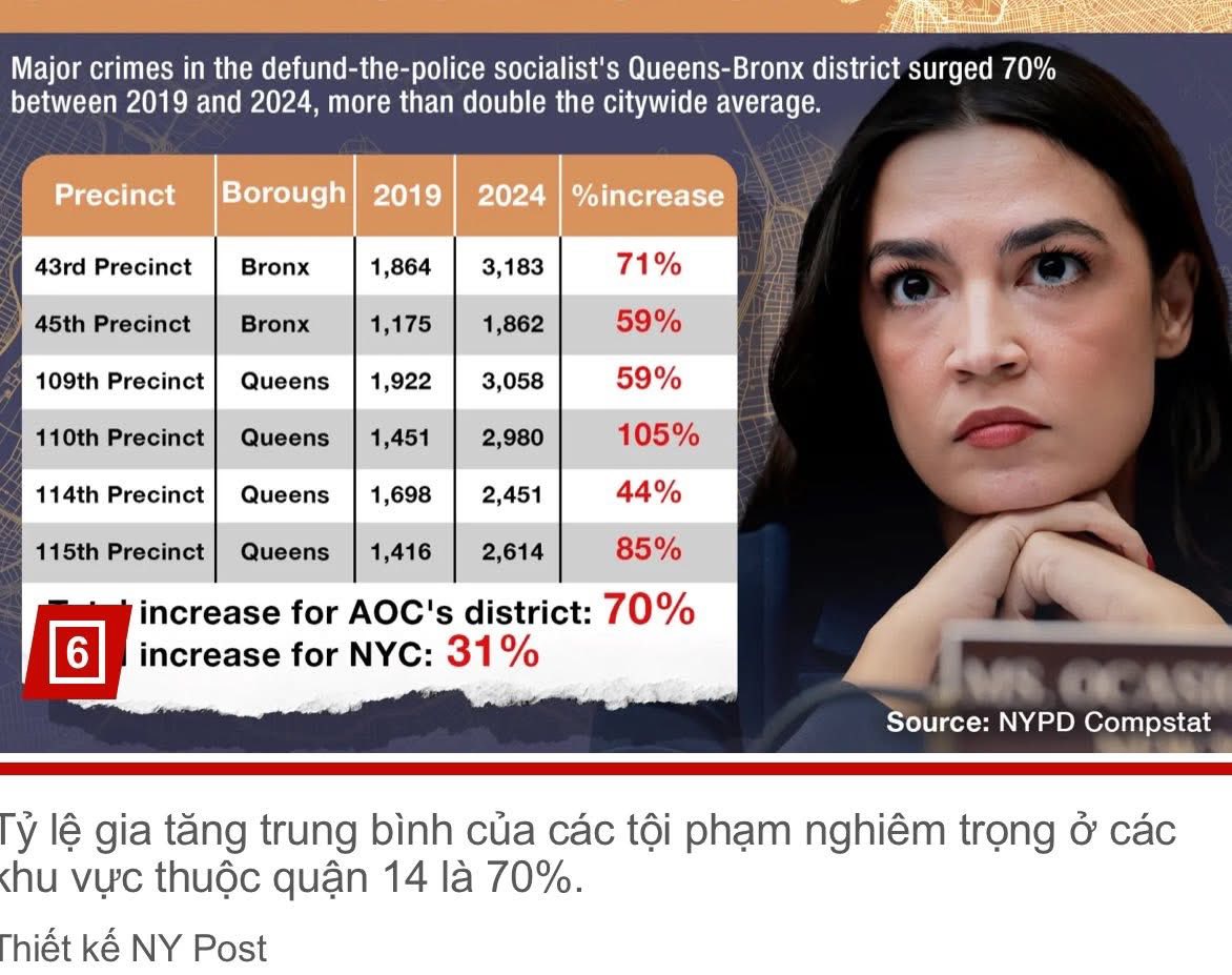 Quận của AOC( ĐDC) chứng kiến tỷ lệ tội phạm tăng 70% cao gấp đôi mức trung bình của NYC: 'Bà ấy không quan tâm'