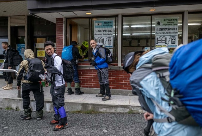 Du khách mua vé để leo núi Phú Sĩ qua đường mòn Yoshida. Ảnh: AFP