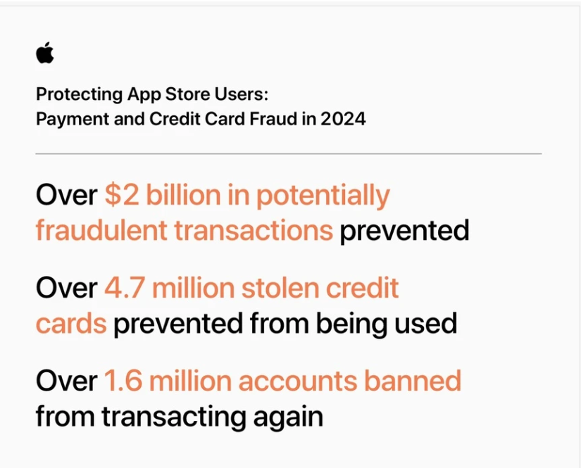 Năm 2024, Apple đã ngăn chặn các hoạt động giao dịch gian lận tiềm ẩn trên App Store, tổng số tiền hơn 2 tỷ USD.