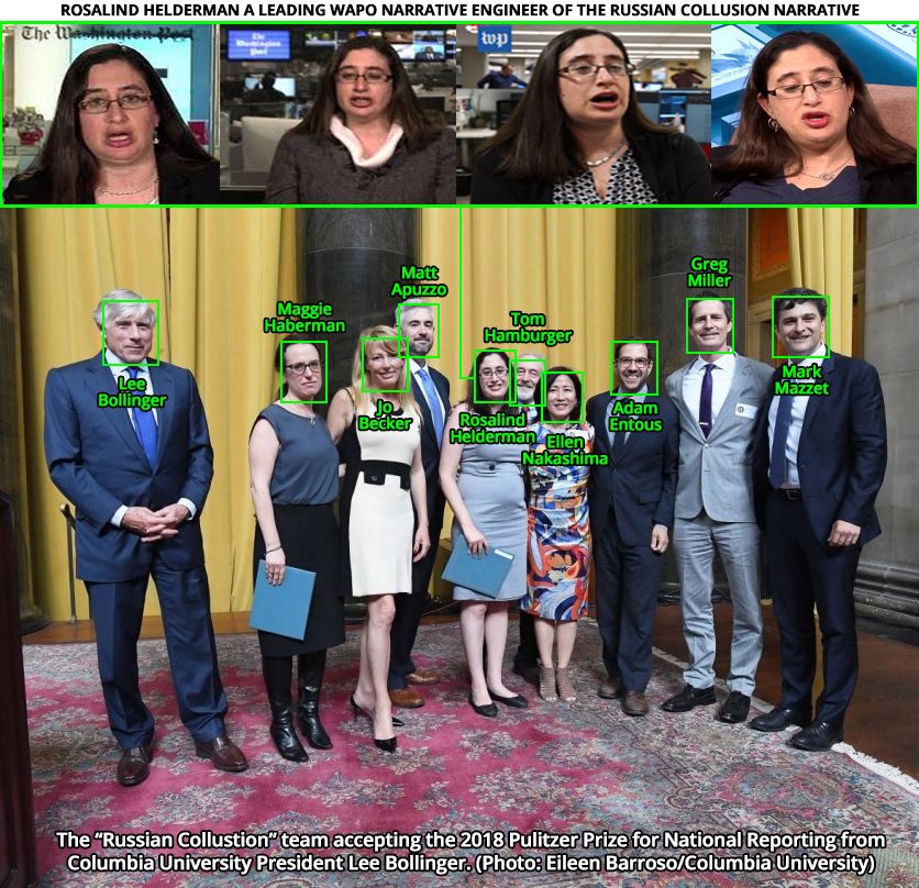 Những người đoạt giải Pulitzer năm 2018 của tờ New York Times và Washington Post cho bài viết nhảm nhí về sự thông đồng giữa Trump và Nga—Từ trái sang: Maggie Haberman, Jo Becker, Matt Apuzzo, Rosalind Helderman, Tom Hamburger, Ellen Nakashima, Adam Entous, Greg Miller và Mark Mazetti nhận giải Pulitzer năm 2018 cho hạng mục Báo cáo quốc gia từ Đại học Columbia.