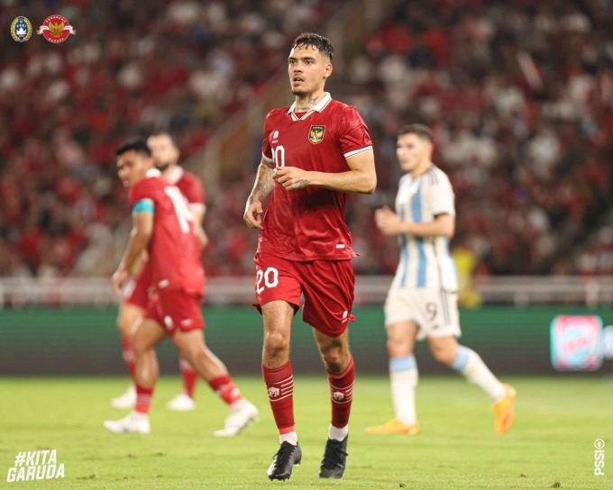 Hậu vệ Indonesia Shayne Pattynama thi đấu trong trận giao hữu thua Argentina 0-2 tại sân Gelora Bung Karno, Indonesia ngày 19/6/2023. Ảnh; PSSI