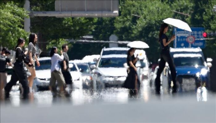 Người dân di chuyển trên đường phố ở Daegu (Hàn Quốc) trong ngày nắng nóng tháng 7/2024. Ảnh: YONHAP/TTXVN
