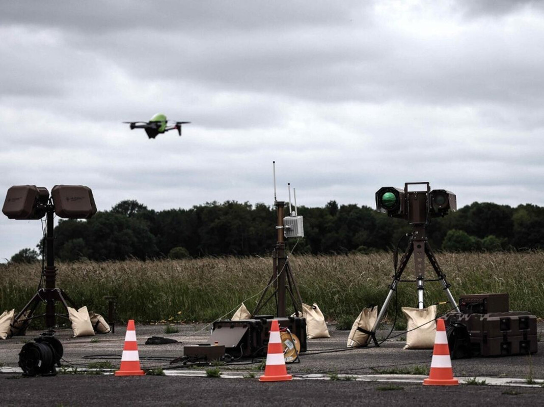 Một chiếc drone bay trước hệ thống Hệ thống Bảo vệ Chống Drone Modular trong một buổi trình diễn được tổ chức bởi tập đoàn hàng không vũ trụ và quốc phòng đa quốc gia của Pháp, Thales, tại Brétigny-sur-Orge, phía nam của Paris vào ngày 27 tháng 5 năm 2025. AFP - THIBAUD MORITZ