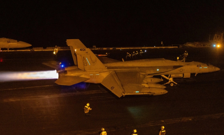 Tiêm kích F/A-18E chuẩn bị cất cánh từ tàu sân bay USS Harry S. Truman trên Biển Đỏ hồi tháng 3. Ảnh: CENTCOM