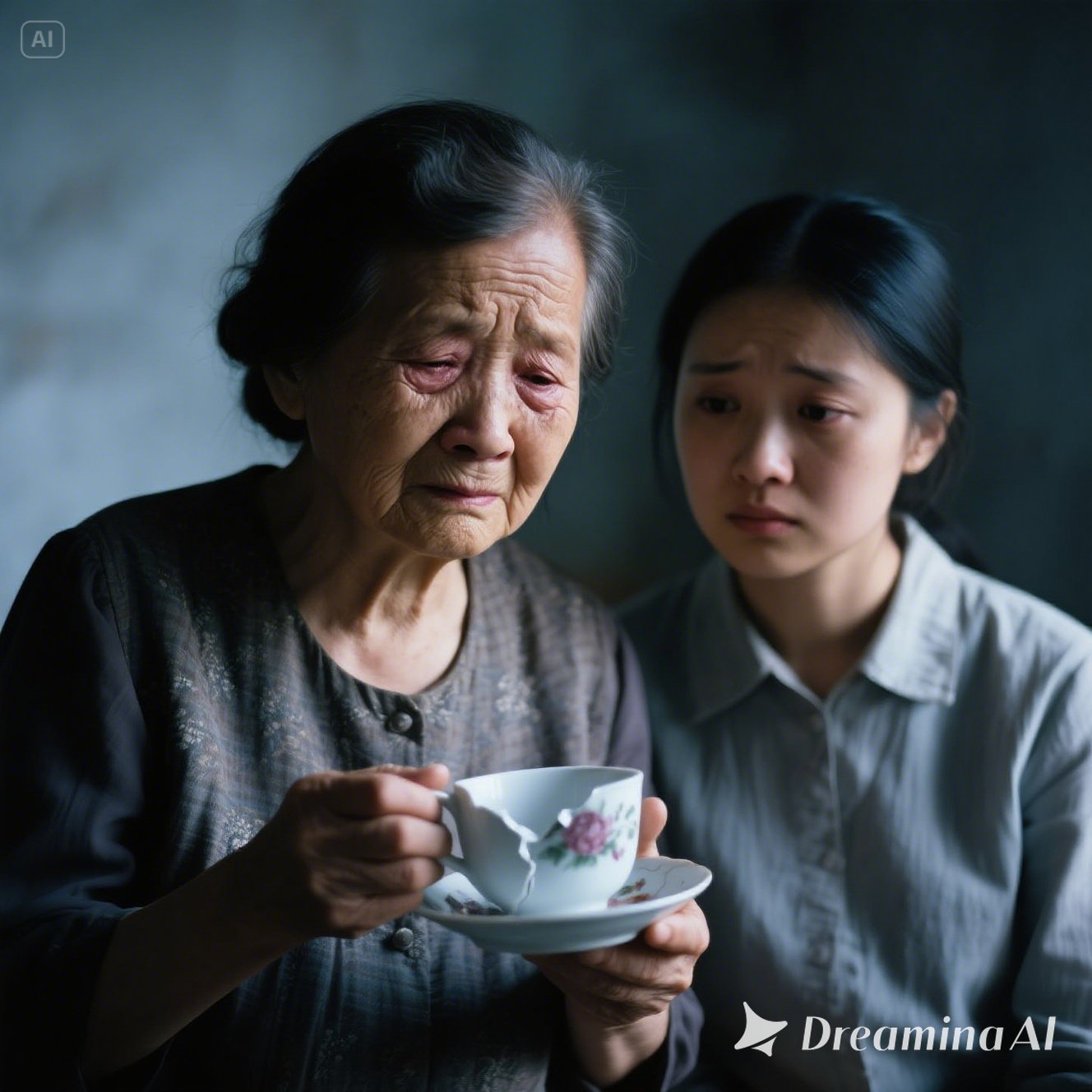 Một người phụ nữ lớn tuổi ngồi lặng lẽ nhìn chiếc ly sứ đã vỡ. Người con gái vội chạy đến: