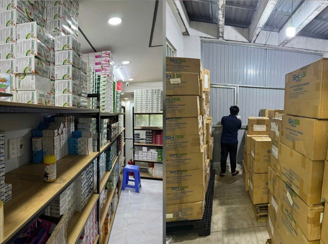 Kho hàng công ty tại quận 12 của ông Nguyễn Phước Sơn còn chứa đầy thuốc men và thực phẩm bổ sung chưa kịp thuê người đem đi tiêu hủy. (Ảnh: Tuổi Trẻ)