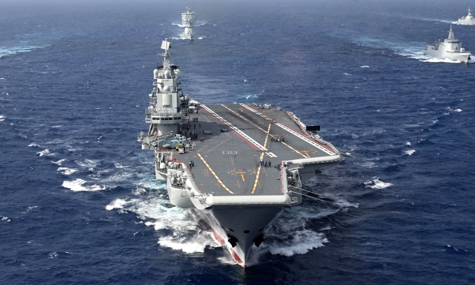 Tàu sân bay Liêu Ninh và các tàu hộ tống diễn tập trên biển tháng 10/2024. Ảnh: AFP