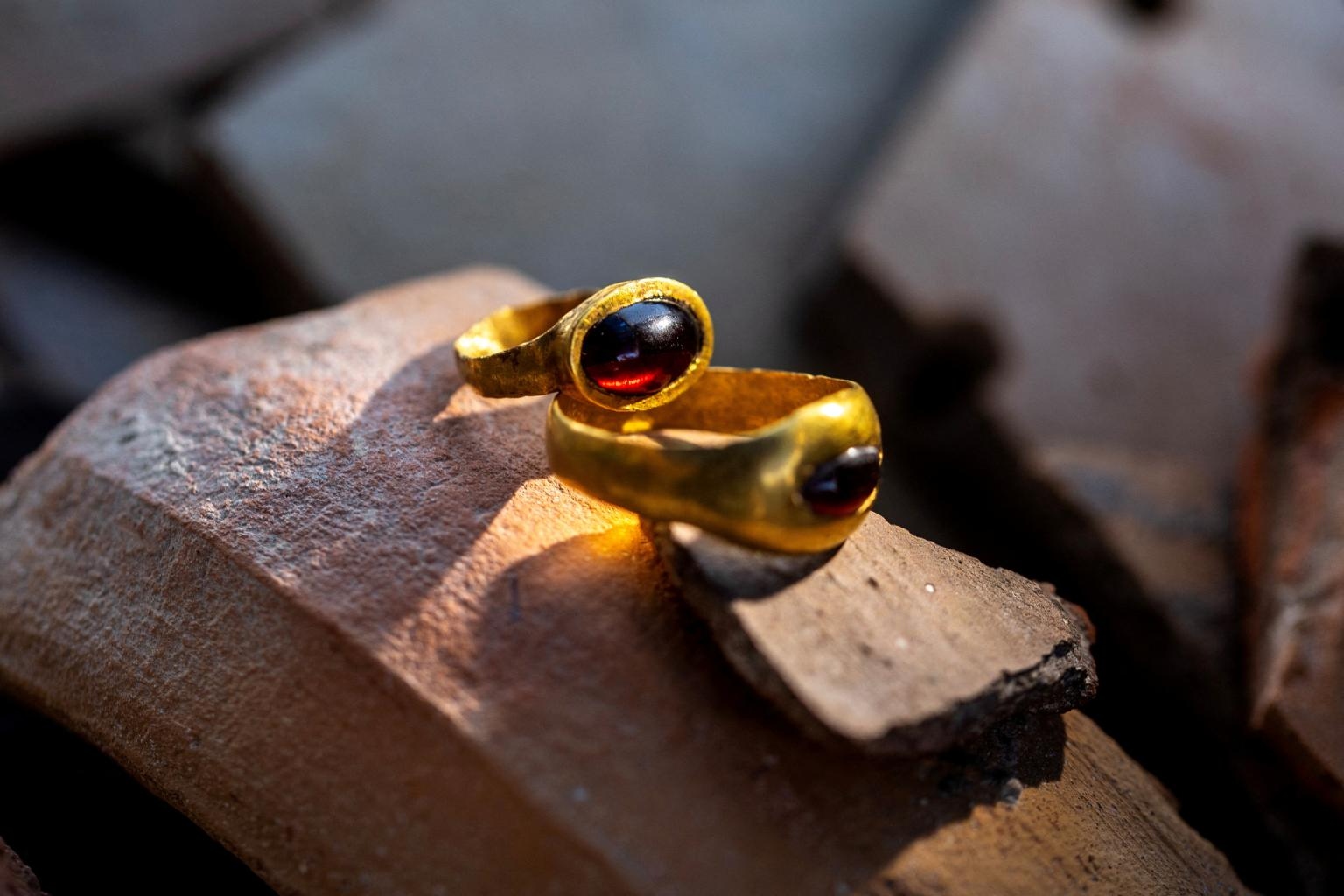 Những chiếc nhẫn vàng 2.300 năm tuổi được trưng bày sau khi được khai quật tại địa điểm khảo cổ Thành phố David ở Jerusalem.