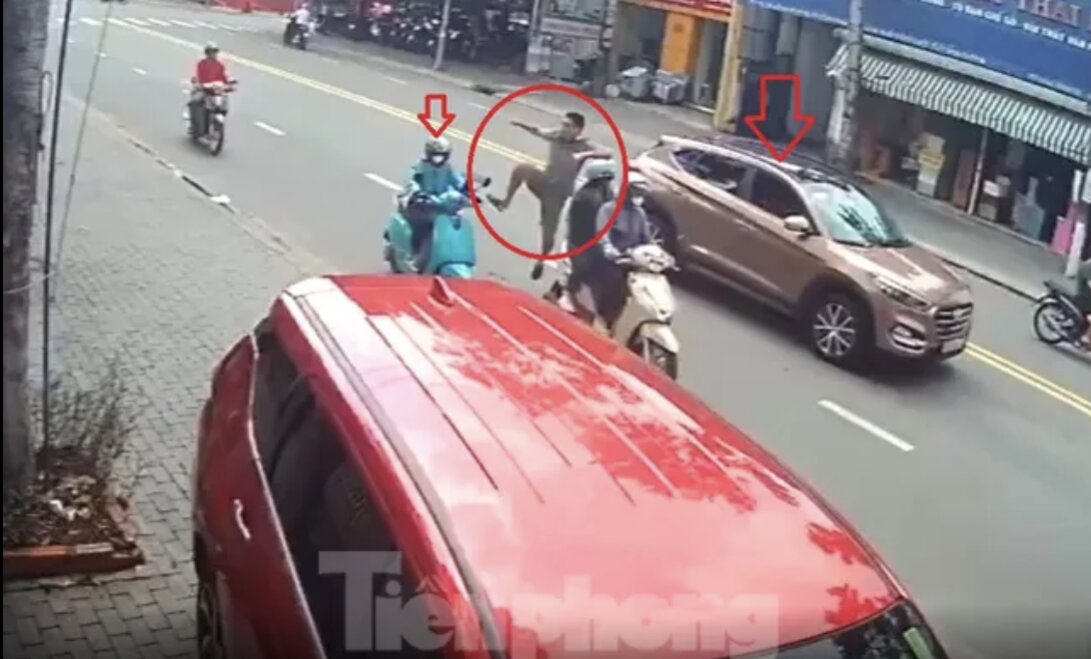 Tuy nhiên, khi đến giao lộ tiếp theo trên tuyến đường này (đoạn trước trụ sở Công an phường Phú Lợi), ô tô dừng lại. Người đàn ông mở cửa xe bước xuống, bất ngờ nhảy lên đạp trúng người chị L.T.C.L khi chị đang điều khiển xe từ phía sau chạy tới. Cú đạp khiến chị L.T.C.L loạng choạng rồi ngã nhào lên vỉa hè.