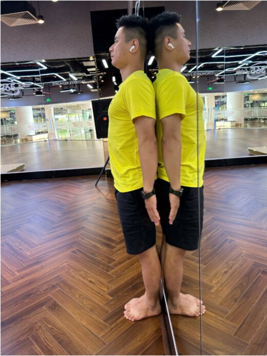 Xương bả vai chạm tường, hai tay thả lỏng hai bên.