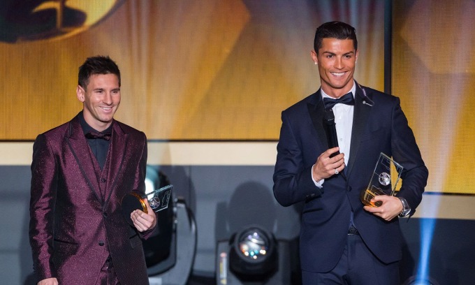 Messi (trái) và Ronaldo tại lễ trao Quả Bóng Vàng FIFA 2014 tại Zurich, Thụy Sĩ ngày 12/1/2025. Ảnh: Sky Sports