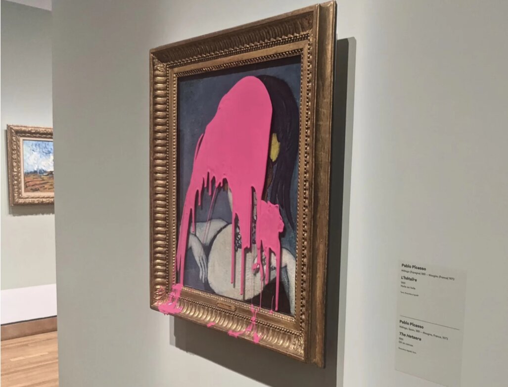 Một thanh niên Canada thuộc nhóm môi trường Last Generation Canada đã bị bắt sau khi tạt sơn hồng lên bức tranh “L’Hétaire” của họa sĩ Pablo Picasso.