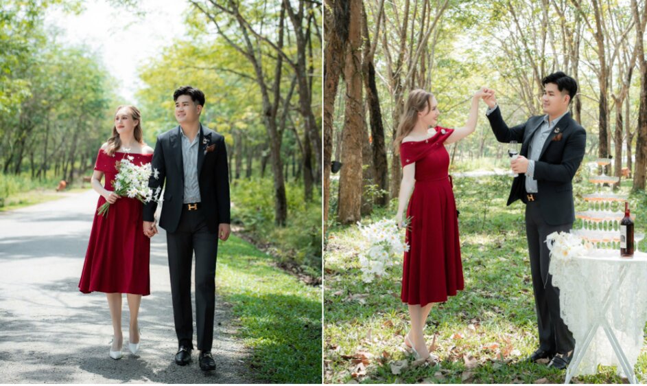 Các nghi thức cưới được tiến hành theo phong tục truyền thống của Việt Nam. Chú rể đến khách sạn đón cô dâu về thắp hương gia tiên, sau đó tại sân khấu nhà trai, đôi bên cùng cắt bánh cưới, rót rượu mừng, cảm ơn hai bên bố mẹ và quan khách.