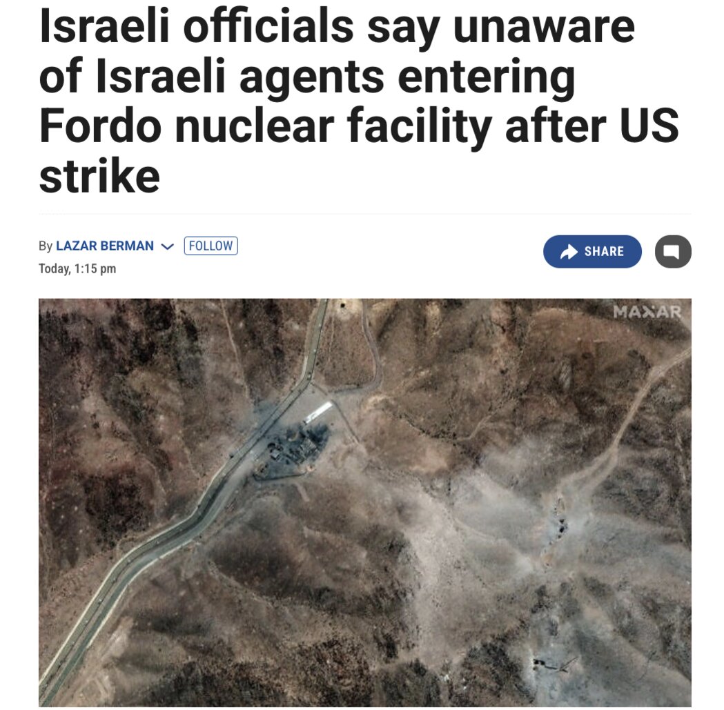 Ngày 25/6/2025, báo The Times of Israel cho biết các quan chức nước này tuyên bố công khai rằng họ không biết gì về bất kỳ chiến dịch nào của nước này bên trong cơ sở hạt nhân Fordow của Iran sau cuộc không kích của Mỹ vào sáng 22/6. Ảnh chụp màn hình tiêu đề bài viết của báo The Times of Israel