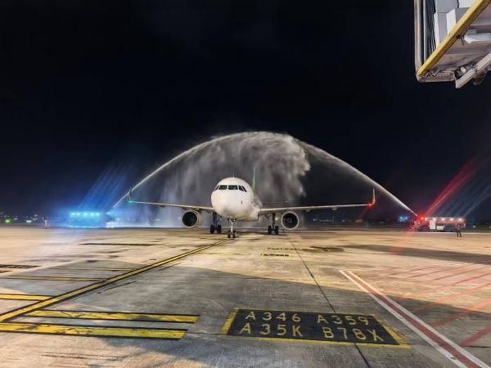 Chuyến bay khai trương được Cảng HKQT Nội Bài đón bằng nghi thức phun vòi rồng trang trọng.