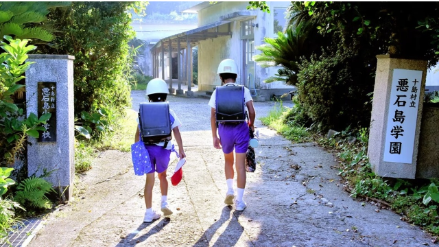 Học sinh trên đảo Akusekijima, thuộc quần đảo Tokara xa xôi của Nhật Bản, đội mũ bảo hiểm trên đường đến lớp vào ngày 30 tháng 6 năm 2025.