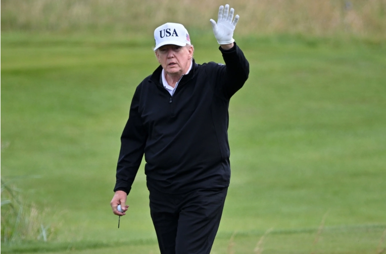 Tổng thống Mỹ vẫy tay chào phóng viên khi đang chơi golf ở câu lạc bộ Trump Turnberry tại Scotland ngày 26/7. Ảnh: AFP
