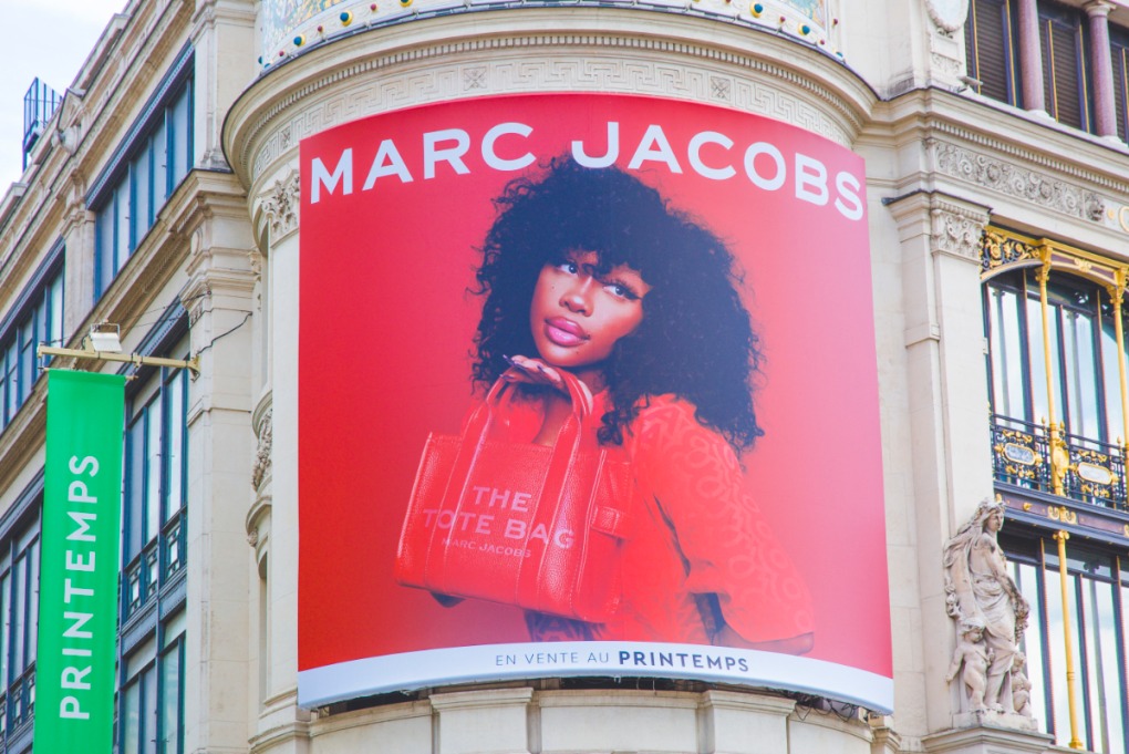 Marc Jacobs quảng cáo trên mặt tiền cửa hàng Printemps Haussmann, Paris, Pháp. Ảnh: AFP