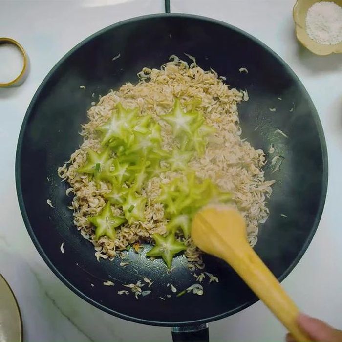 Cho khế vào đảo đều tay, nấu thêm 3–5 phút. Nêm 1 thìa nước mắm, 2 thìa đường, 2 thìa hạt nêm, chút bột ngọt, tiêu và ớt. Khi tép săn chắc và thấm đều gia vị, thêm hành lá, đảo nhanh rồi tắt bếp.