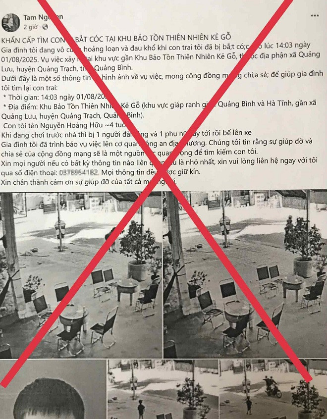 Ngày 2/8, trên mạng xã hội Facebook xuất hiện thông tin gây hoang mang dư luận về một vụ bắt cóc trẻ em xảy ra trên địa bàn giáp ranh tỉnh Hà Tĩnh (tỉnh Quảng Bình cũ) kèm hình ảnh mô tả cảnh bắt cóc.