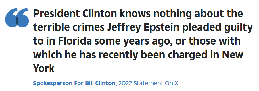 "Tổng thống Clinton không biết gì về những tội ác khủng khiếp mà Jeffrey Epstein đã nhận tội ở Florida vài năm trước, hoặc những tội mà ông ta gần đây bị buộc tội ở New York," một Tuyên bố năm 2022 của Clinton có đoạn: