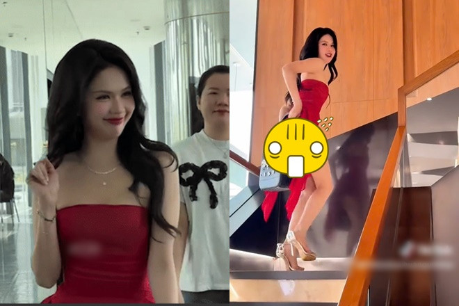 Đáng chú ý, khi di chuyển lên cầu thang, nhiều người thót tim lo sợ độ dài chiếc váy không che nổi hết vòng 3 người đẹp. Song Ngọc Trinh cũng cho thấy sự nhanh nhạy để tránh lộ điểm thiếu tế nhị trước ống kính. Khoảnh khắc chân dài Trà Vinh vất vả lấy túi xách size lớn để che chắn từ phía sau nhiều người bật cười.
