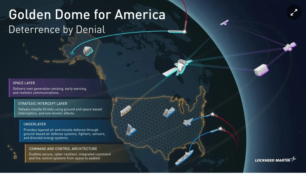 Hệ thống phòng thủ tên lửa “Vòm Vàng” - dự án trọng điểm của chính quyền Trump - sẽ bao gồm bốn tầng bảo vệ, trong đó một tầng đặt trên vệ tinh và ba tầng trên mặt đất, với 11 tổ hợp tên lửa tầm ngắn bố trí khắp lục địa Mỹ, Alaska và Hawaii, theo thông tin này xuất hiện trong bộ slide trình chiếu của chính phủ Mỹ về dự án.