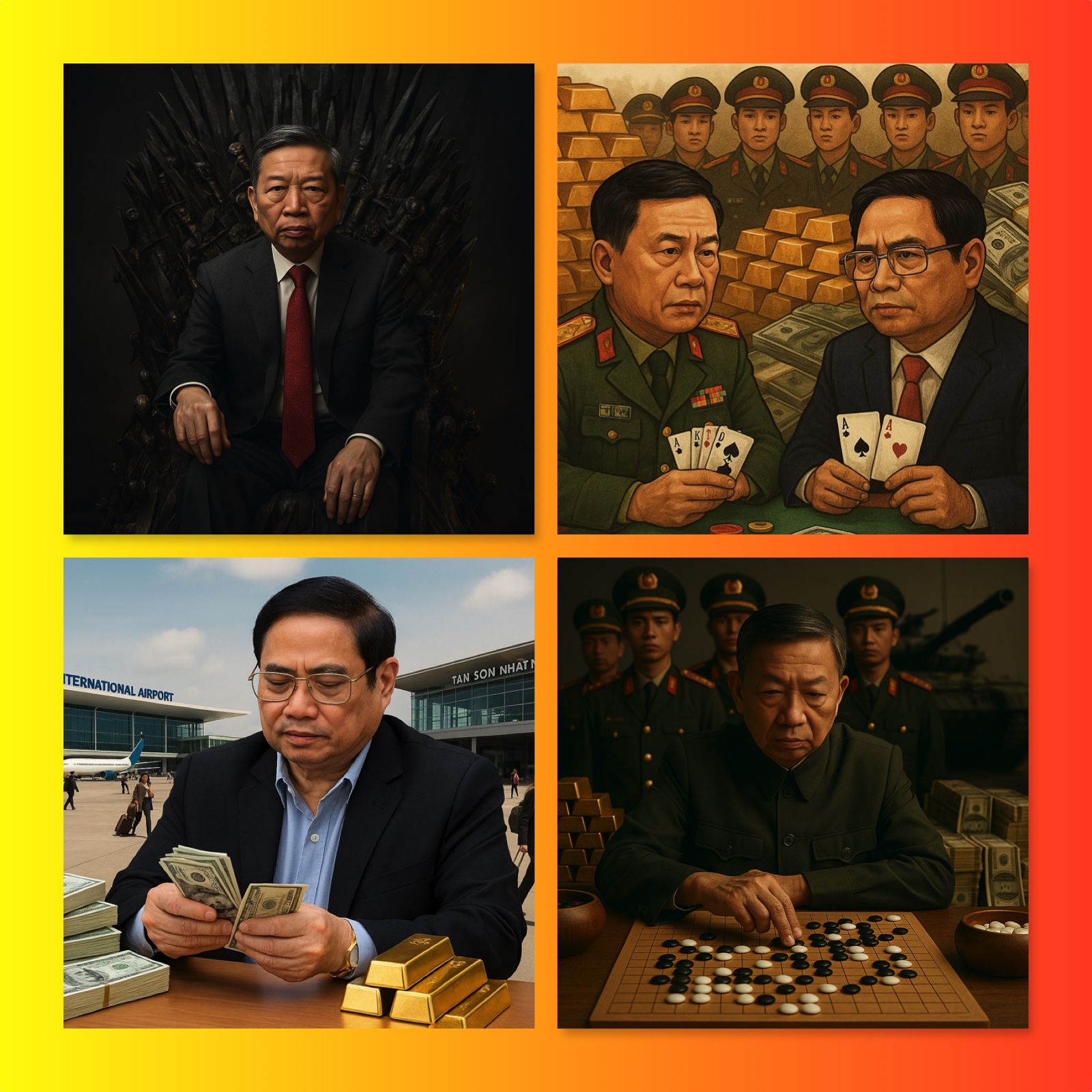 Đại hội 13 từng dựng nên một “bộ tứ trụ” được quảng bá là tinh hoa lãnh đạo: Nguyễn Phú Trọng, Nguyễn Xuân Phúc, Phạm Minh Chính, Vương Đình Huệ. Thế nhưng chỉ sau vài năm, bức tranh quyền lực ấy tan tác nhanh như ban nhạc pop vừa ký hợp đồng xong đã… tan rã. Trọng qua đời, Phúc rời sân khấu, Huệ mất ghế, chỉ còn lại Chính ngồi lẻ loi giữ cái micro trong khi ánh đèn sân khấu chập chờn. Nhiệm kỳ này ghi kỷ lục chưa từng có: hai đời Tổng bí thư, bốn đời Chủ tịch nước, hai đời Chủ tịch Quốc hội. Một cuộc chơi hao người chưa từng có, minh chứng cho sự khốc liệt của những trận cắn xé trong cùng một ngôi đình Đảng.