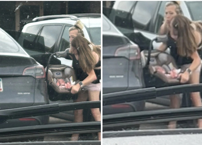 Cặp song sinh dính liền được nhìn thấy đang bế một em bé sơ sinh lên ô tô. (Nguồn: BackGrid)
