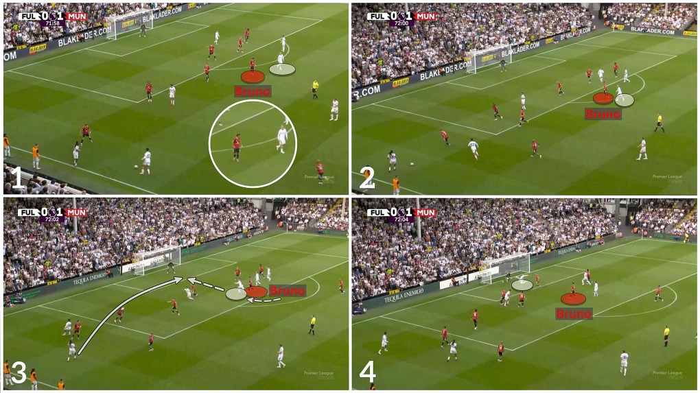 Fulham liên tục áp đảo hàng tiền vệ Man Utd - tuyến lần lượt được hợp bởi Fernandes và Casemiro, rồi Fernandes và Mason Mount, sau đó là Fernandes và Manuel Ugarte. Cặp tiền vệ trung tâm thay đổi suốt trận, nhưng lúc nào cũng có Fernandes hiện diện.